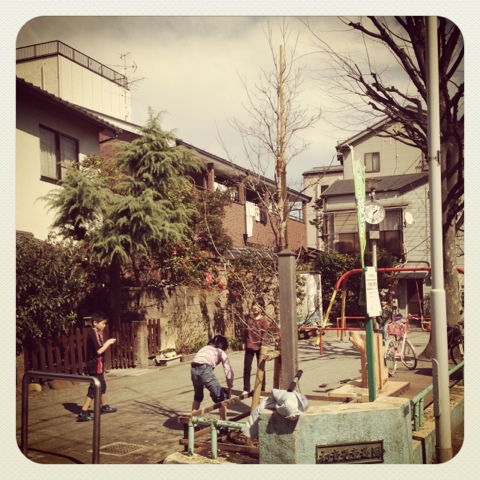 実行委員会日記 2012年3月27日2012年3月27日芸工展サイト 谷中の公園 先日、芸工展のミーティングに向かう途中、公園で子どもたちが遊んでいました。夢中になって。何やら自分たちで考えたオリジナルな遊びのよう。 最近、一人ゲームをしている子を見かけることが多かった。だから、公園で自分たち独自の遊びをしている子どもらをみて、なんだか嬉しかった。 やっぱり遊びは外で!友達と!体を動かして!が一番ですね。
