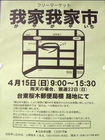 お知らせ 2012年4月3日2014年4月3日芸工展サイト 4/15は、我家我家市 今日は上野桜木で定期的に開催されている「我家我家市」を紹介します。 日時:2012.4.15 (日) 9時〜15時 ※雨天の場合は4/22(日) 場所:台東桜木郵便局横の路地 住所:上野桜木1-8-6付近 身近な生活用品や手作り小物、飲食のお店も参加しています。 普段は生活の道である路地が、アットホームな賑わいをみせるなんともあたたかいフリーマーケット。 ぜひ一度、お立ち寄りください。