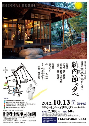 芸工展◆参加企画紹介 2012年10月12日2012年10月15日芸工展サイト [116]新内ってなあに・ぶんやを偲ぶ [B3/C1] こちらも必見です! [企画紹介] 101歳迄現役を貫いた師匠を偲び社中が谷中の稽古場で心を込めての演奏会を。また文弥の代表作一葉「十三夜」を旧安田邸で宮之助が語ります。 ▷岡本宮之助 旧安田楠雄邸庭園 (文京区千駄木5-20-18) 岡本宮之助新内節稽古場 (台東区谷中1-6-11) 岡本宮之助新内節稽古場/7(日)14(日)13:00~ 旧安田楠雄邸庭園/ 13(土)18:15~20:00 (ご予約下さい)