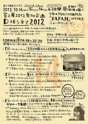 芸工展◆参加企画紹介 2012年10月15日2012年10月15日芸工展サイト [112]D坂シネマ [B3] 住宅地の一角にある蔵の中に集って映画を観る。こんな体験は初めてでした。ここでしか味わえない空気があります。 [112]D坂シネマ [B3] 谷根千工房 谷根千<記憶の蔵> (文京区千駄木5-17-3 映画保存協会内) 14日~16日 14(日)12:00~20:00 、15(月)・16(火)18:30~21:00 松川八洲雄作品『JAPAN』(1973年)、『住民票を返せ!』(2008年)、『シェーナウの想い~自然エネルギー社会を子どもたちに~』ほか、続々追加。
