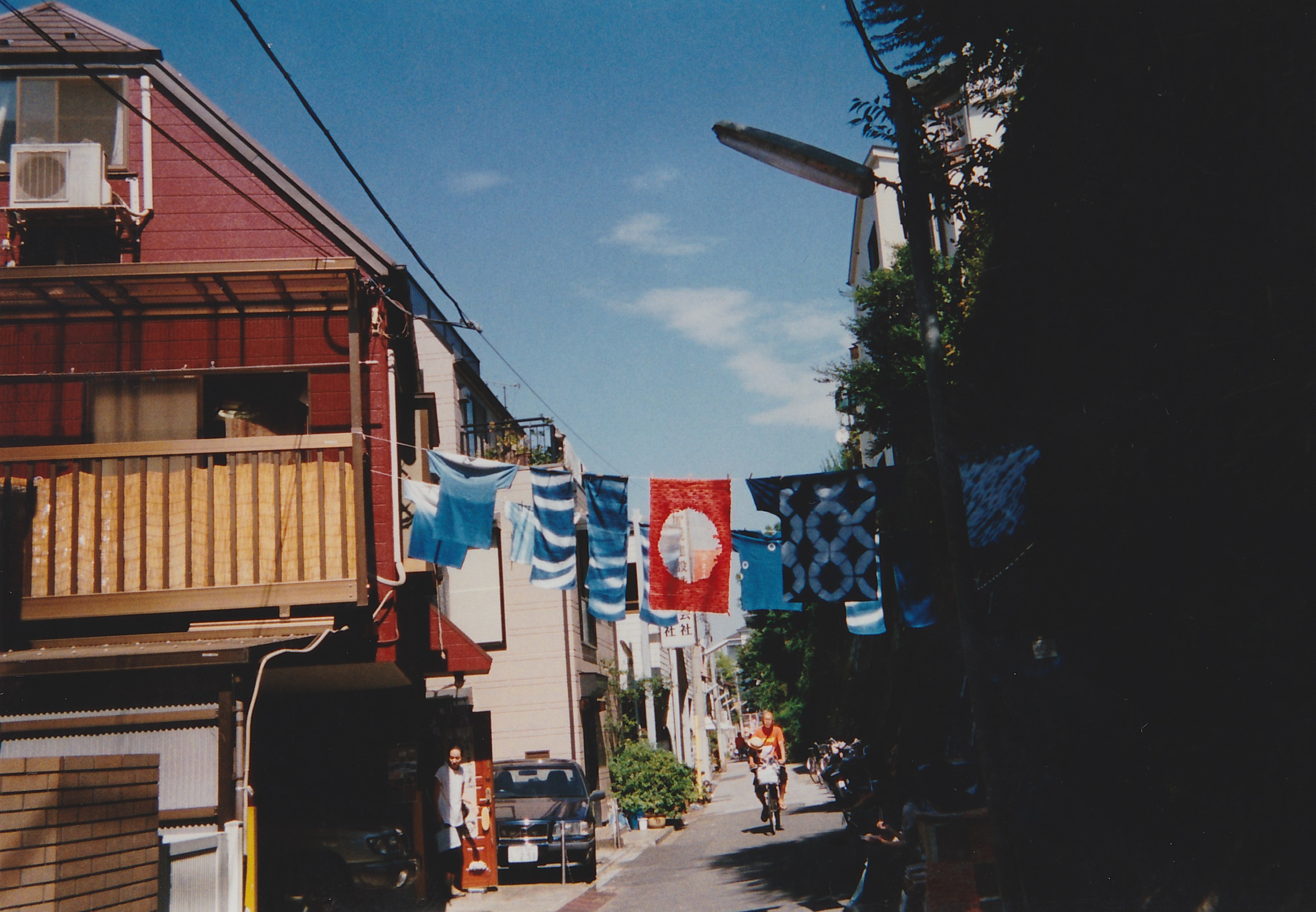 裏路地の崖と民家のベランダをひもで結んでそこへのれんをかける。